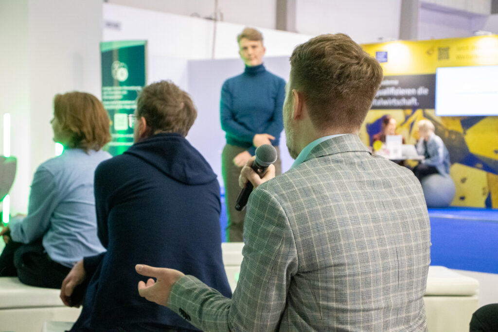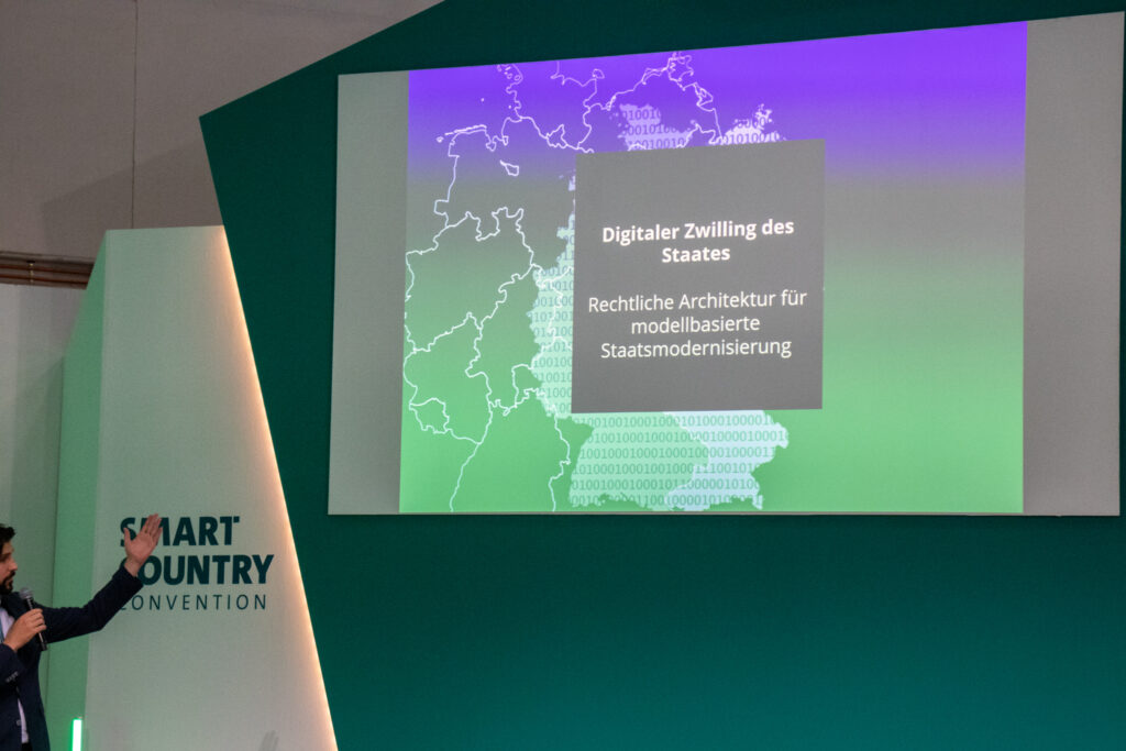 Am zweiten Messetag übernahmen Moritz Ahlers und Prof. Dr. Sven Müller-Grune eine gut besuchte Bühnen-Session für das NEGZ. Moderiert von Inga Karrer diskutierten die beiden die noch unveröffentlichte Folgestudie des NEGZ-Impulspapiers „Digitaler Zwilling des Staates“. Die neue Publikation soll am Beispiel einer öffentlichen Aufgabe zeigen, wie juristisch-architektonische Modellierung Reformpfade sichtbar machen kann. Ein Video-Beitrag von Benjamin Degenhart demonstrierte das Ganze anschaulich für das Publikum, das anschließend Gelegenheit hatte, Fragen zu stellen und in die Diskussion zu gehen.